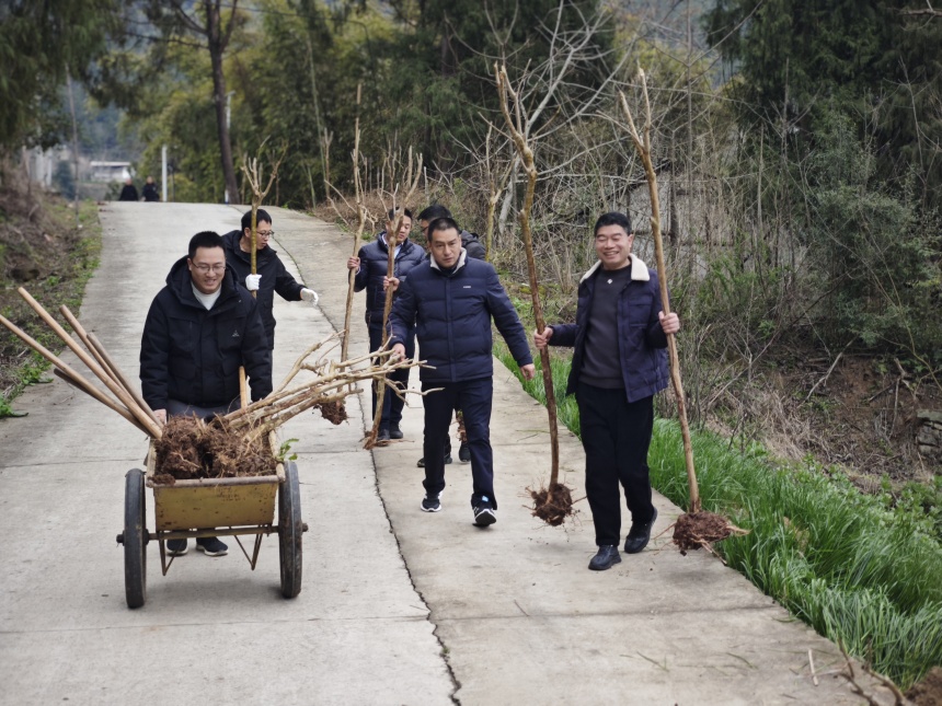 党旗飘扬聚合力,携手共植振兴林。活动当天,参加植树活动的党员们干部分工协作、干劲十足。党员们带头挥锹培土、扶苗浇水,共同栽种紫荆树50余株,为乡村注入“绿色动能”,持续深化“党建+产业”帮扶模式,助力乡村可持续发展。