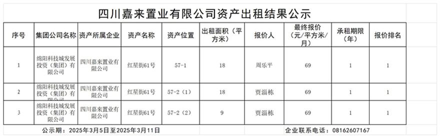 四川嘉来置业有限公司资产出租结果公示