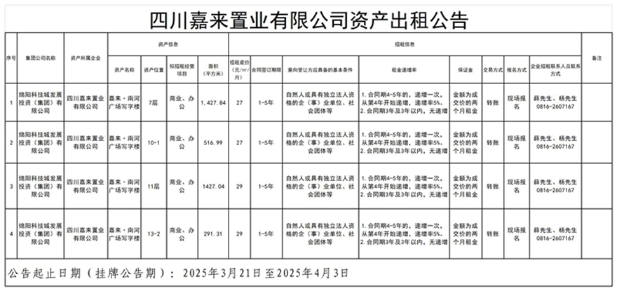 四川嘉来置业有限公司资产出租公告