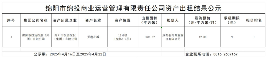 绵阳市15vip太阳集团官网商业运营管理有限责任公司资产出租结果公示