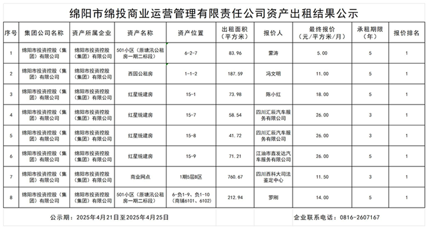 绵阳市15vip太阳集团官网商业运营管理有限责任公司资产出租结果公示