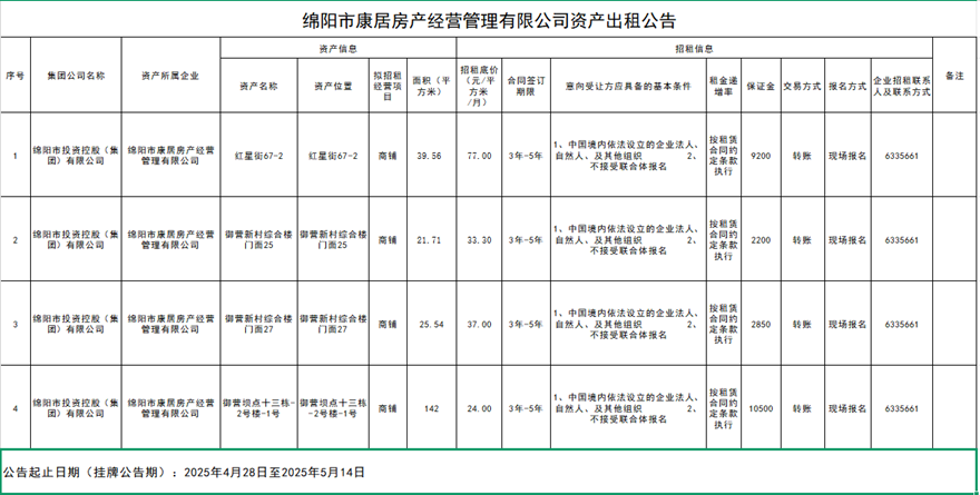 绵阳市康居房产经营管理有限公司资产出租公告