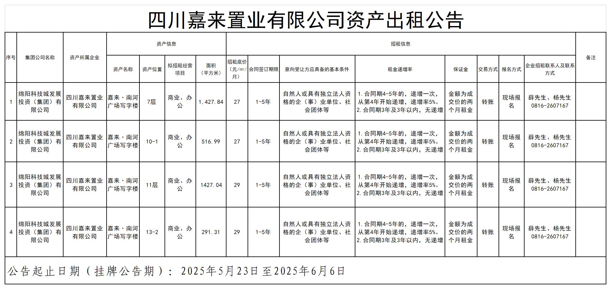 四川嘉来置业有限公司资产出租公告