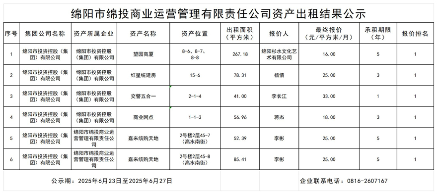 绵阳市15vip太阳集团官网商业运营管理有限责任公司资产出租结果公示
