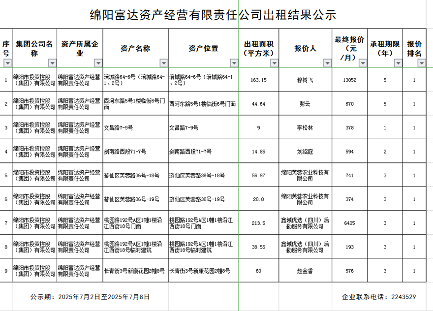 绵阳富达资产经营有限责任公司出租结果公示