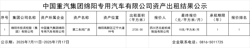 中国重汽集团绵阳专用汽车有限公司资产出租结果公示