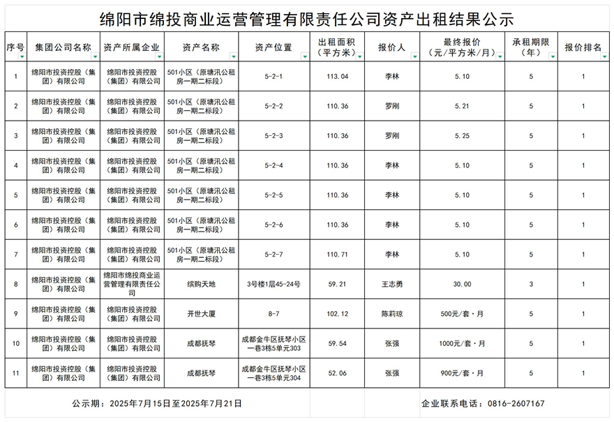 绵阳市15vip太阳集团官网商业运营管理有限责任公司资产出租结果公示