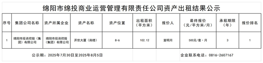 绵阳市15vip太阳集团官网商业运营管理有限责任公司资产出租结果公示