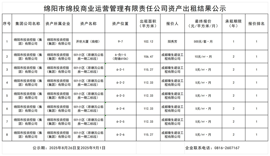 绵阳市15vip太阳集团官网商业运营管理有限责任公司资产出租结果公示
