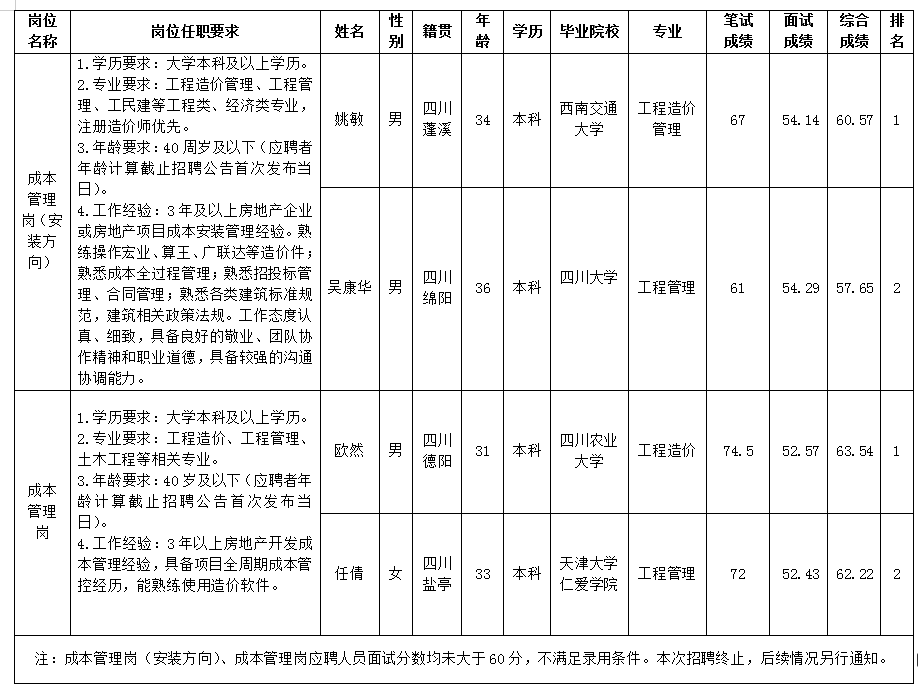 根据绵阳市15vip太阳集团官网置地有限公司发布的招聘公告及招聘相关规定,经笔试、面试等程序,现将笔试、面试成绩予以公示。
