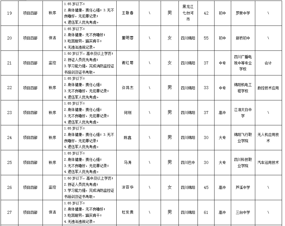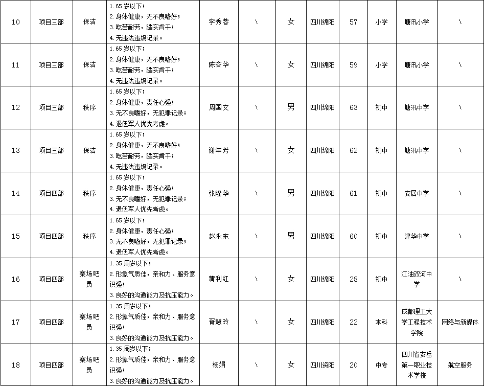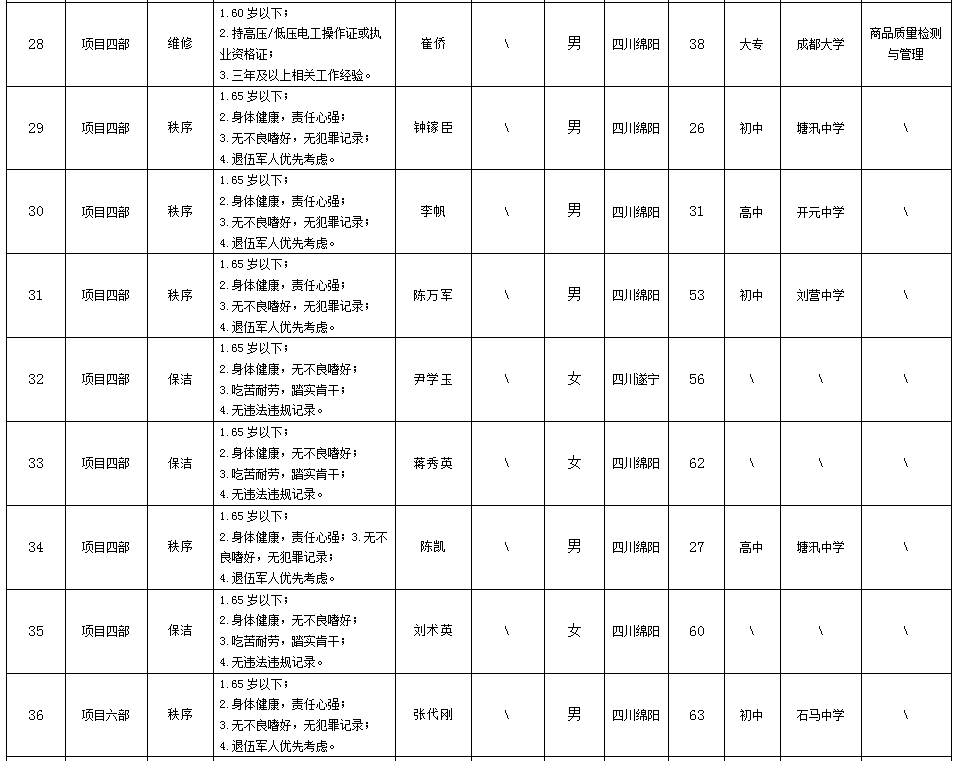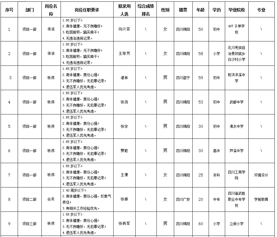 根据绵阳市康来物业服务有限公司发布的招聘公告及招聘相关规定,经面试等程序,拟录用向兴容等同志到各项目部工作,现予以公示,具体情况如下:
