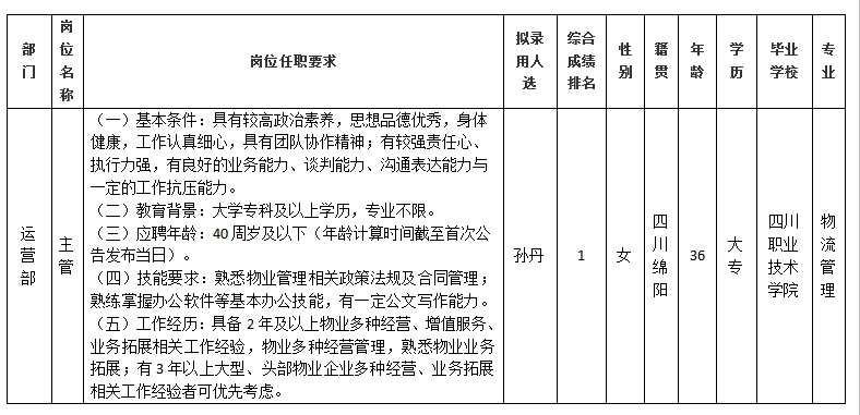 根据绵阳市康来物业服务有限公司发布的招聘公告及招聘相关规定,经笔试、面试、背景调查等程序,拟录用孙丹同志到绵阳市康来物业服务有限公司运营部工作,现予以公示,具体情况如下: