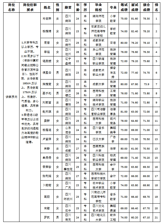根据四川越王楼文化传播有限公司发布的招聘公告及招聘相关规定,经笔试、面试等程序,现将笔试(面试)成绩予以公示。