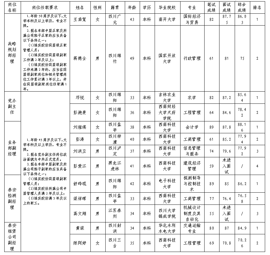 根据绵阳市汽车实验驾驶技术学校股份有限公司发布的内部竞聘公告及内部竞聘相关规定,经笔试、面试等程序,现将内部竞聘成绩予以公示。