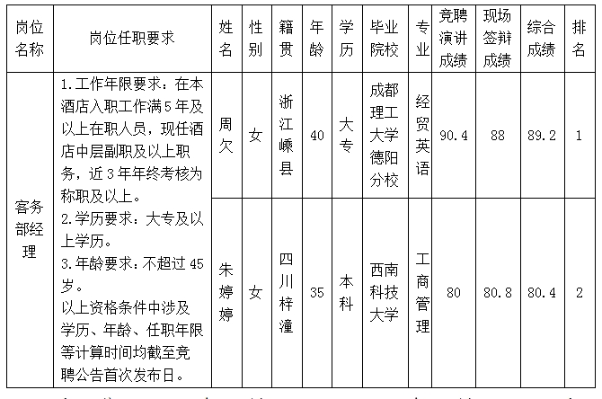 根据绵阳富乐山九洲国际酒店有限公司关于客务部经理内部竞聘公告及招聘相关规定,经竞聘演讲、现场答辩等程序,现将竞聘成绩予以公示。