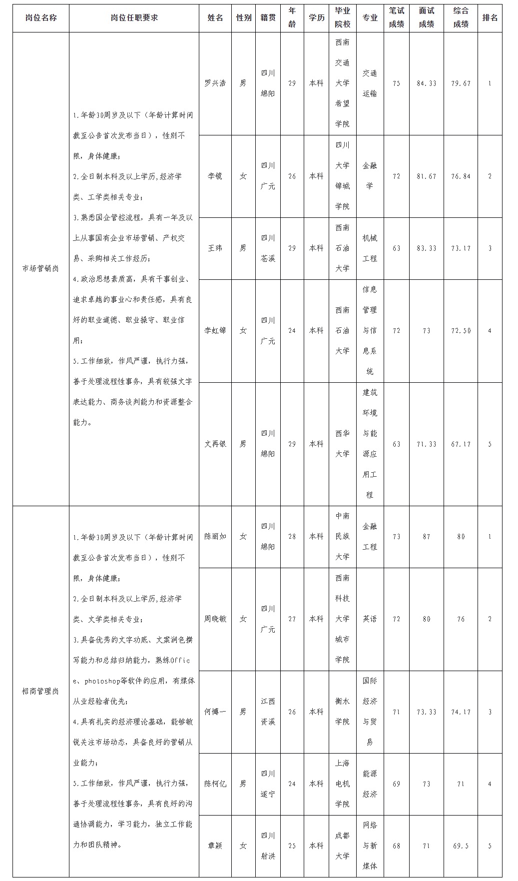 根据绵阳市15vip太阳集团官网商业运营管理有限责任公司发布的招聘公告及招聘相关规定,经笔试、面试等程序,现将笔试、面试成绩予以公示。