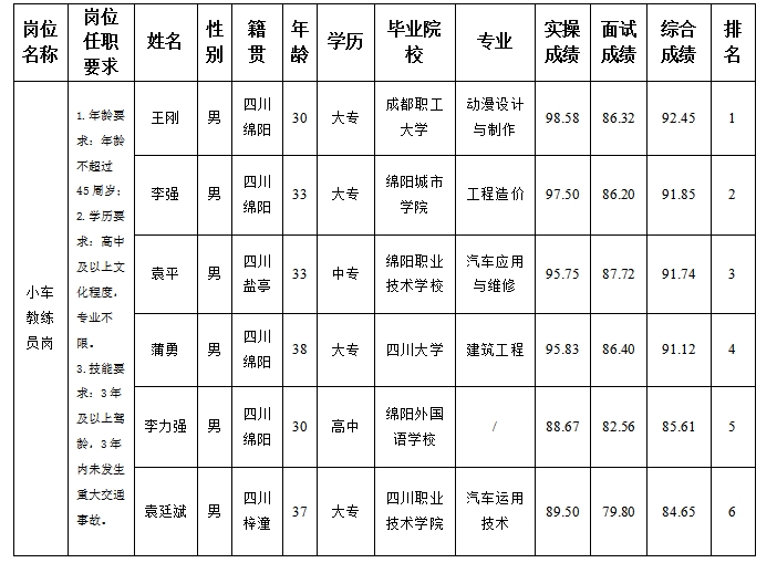 根据绵阳市汽车实验驾驶技术学校股份有限公司发布的招聘公告及招聘相关规定,经面试、实操等程序,现将面试、实操成绩予以公示。