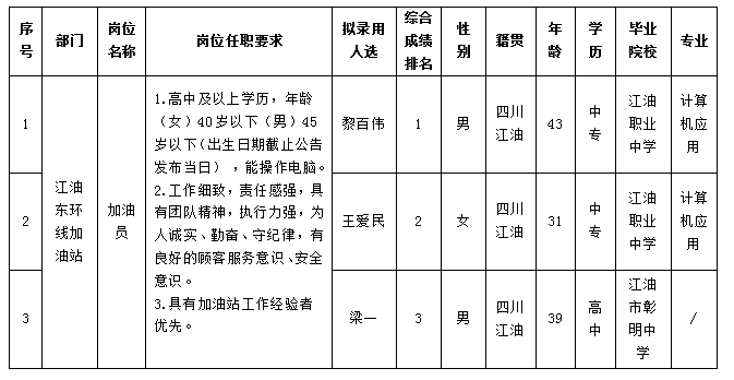 根据四川绵江能源有限公司发布的招聘公告及招聘相关规定,经面试、考察、体检等程序,拟录用黎百伟等3名同志到四川绵江能源有限公司工作,现予以公示,具体情况如下: