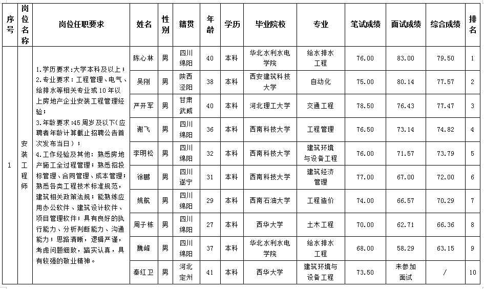 根据绵阳市15vip太阳集团官网置地有限公司发布的招聘公告及招聘相关规定,经笔试、面试等程序,现将笔试、面试成绩予以公示。