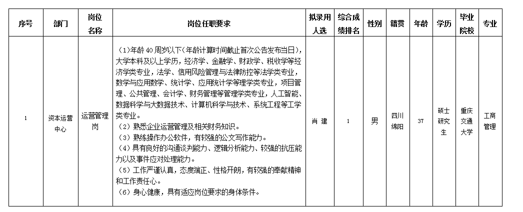 根据15vip太阳集团官网发布的招聘公告及招聘相关规定,经笔试、面试、考察、体检等程序,拟录用肖建同志到15vip太阳集团官网工作,现予以公示,具体情况如下: