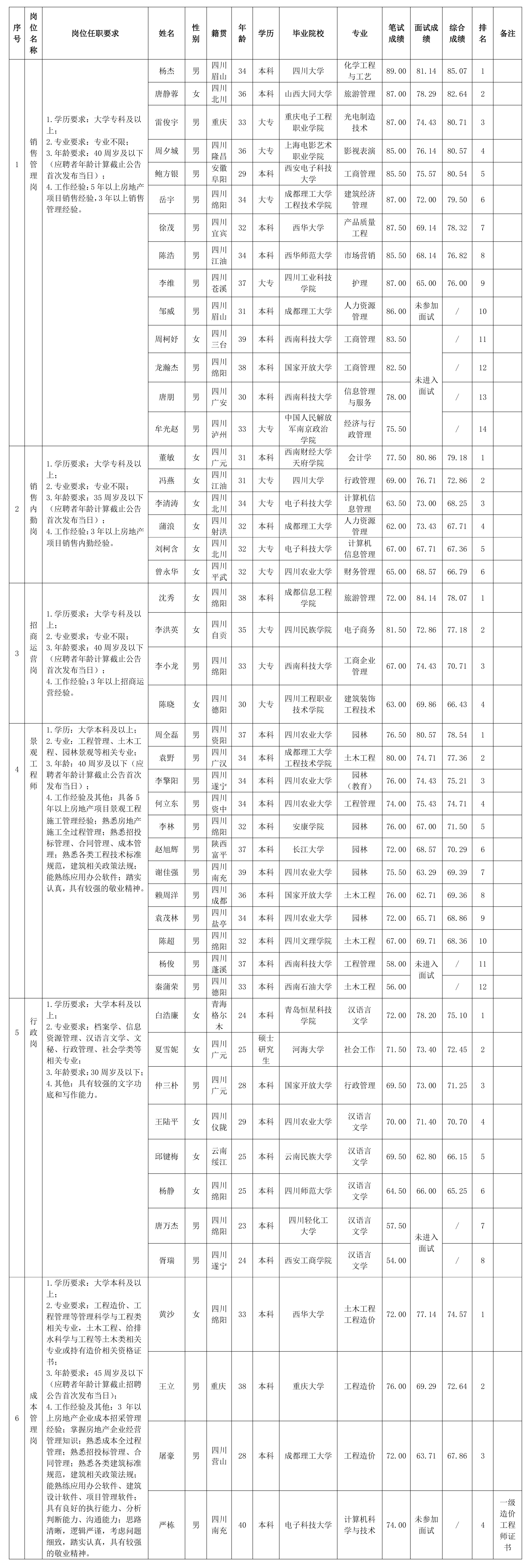 根据绵阳市15vip太阳集团官网置地有限公司发布的招聘公告及招聘相关规定,经笔试、面试等程序,现将笔试、面试成绩予以公示。