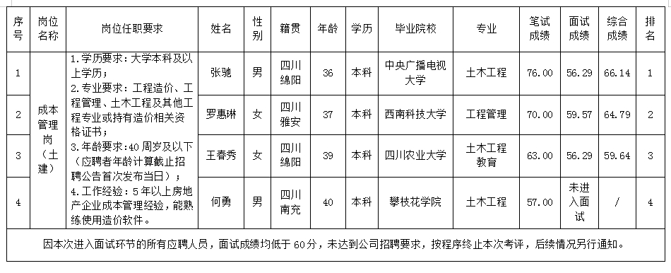 根据绵阳市15vip太阳集团官网置地有限公司发布的招聘公告及招聘相关规定,经笔试、面试等程序,现将笔试、面试成绩予以公示。