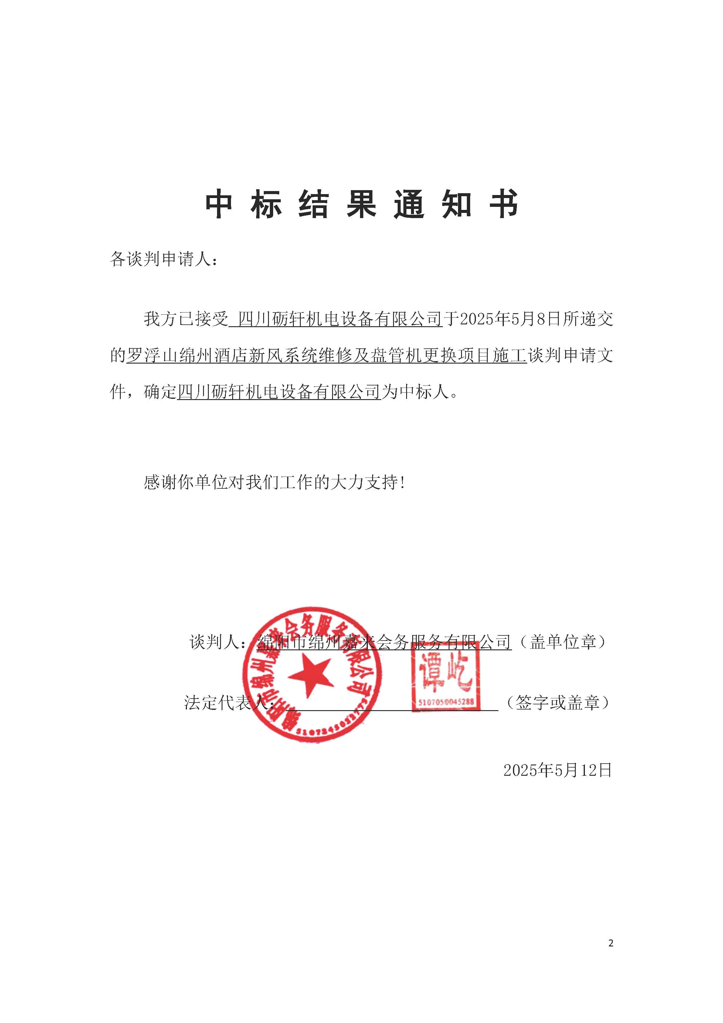 罗浮山绵州酒店新风系统维修及盘管机更换项目施工中标结果通知