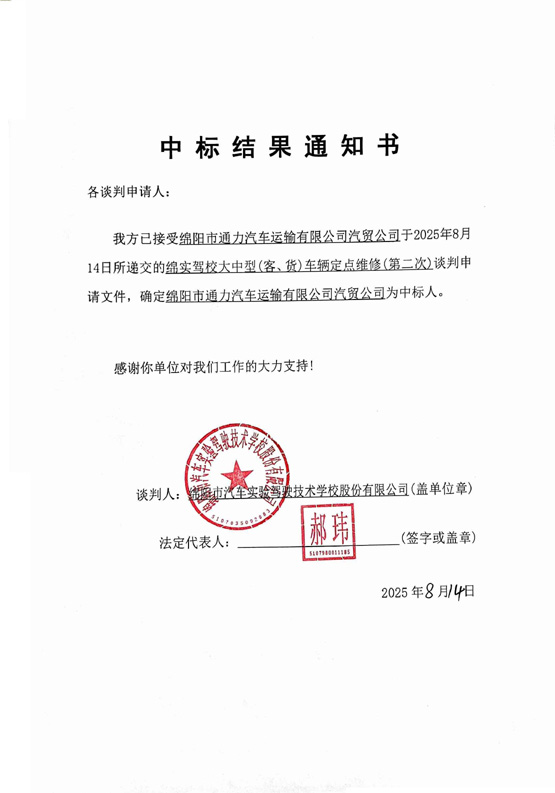 绵实驾校大中型(客、货)车辆定点维修(第二次)中标结果通知