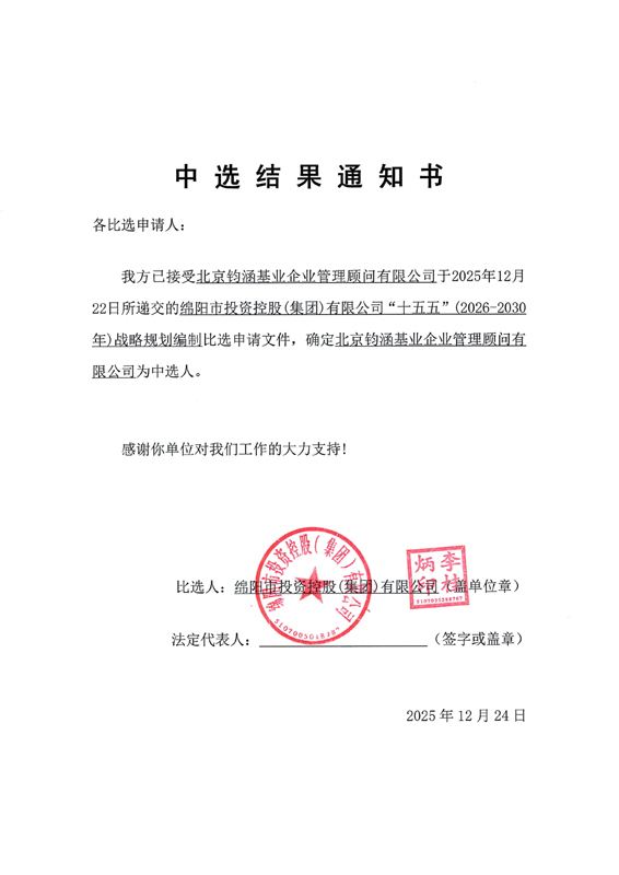 绵阳市投资控股(集团)有限公司“十五五”(2026-2030年)战略规划编制中选结果通知
